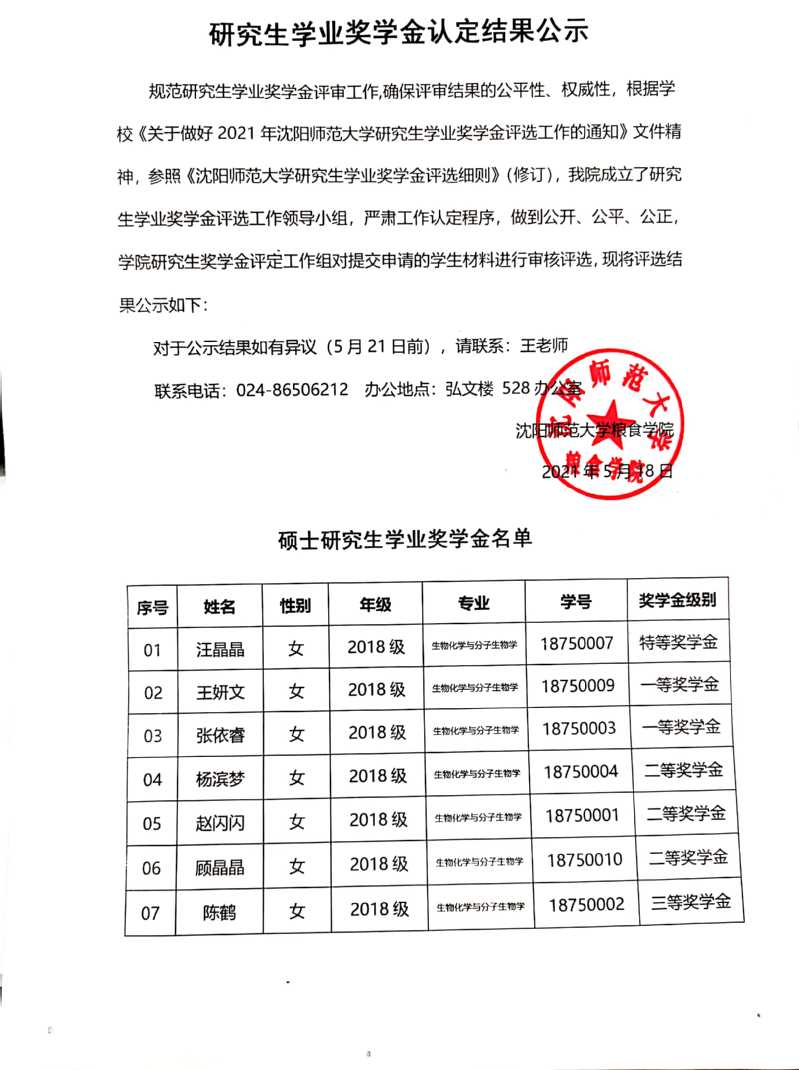 2021年研究生学业奖学金公示 (公示期:截止到5月21日)