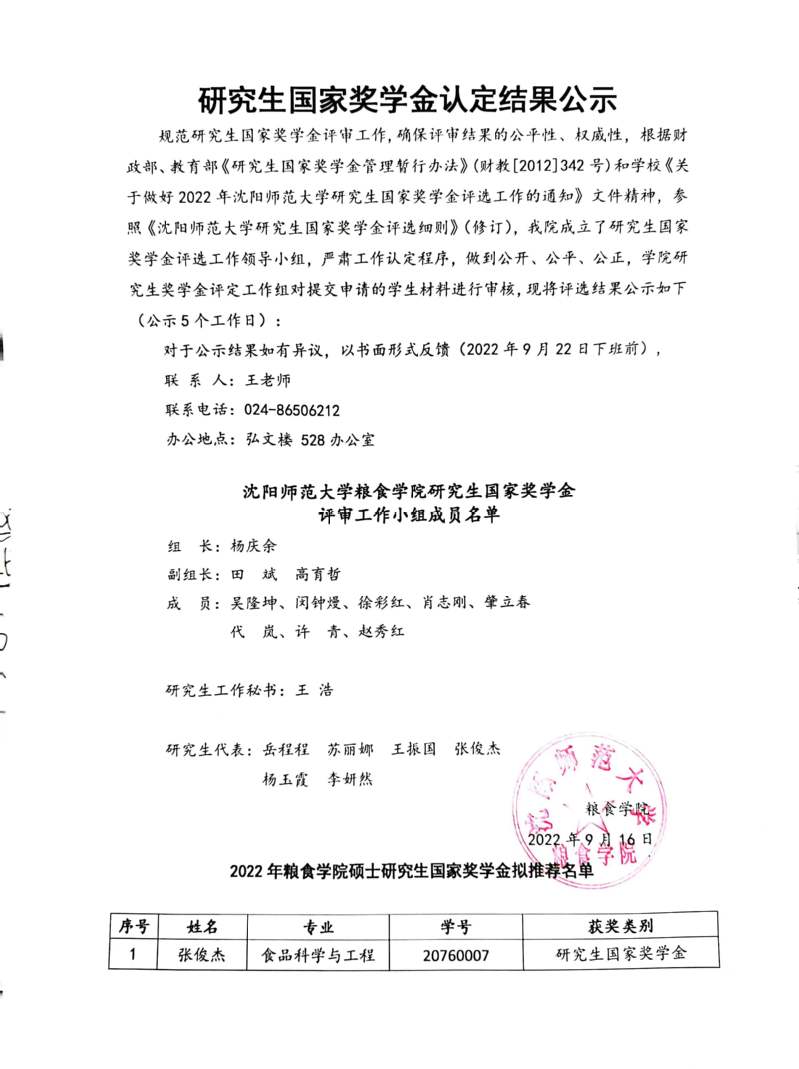 2022年公司研究生国家奖学金认定结果公示